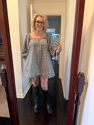 I recently had a baby so I’m leaning into loose items and this dress fit the bill! Im glad I took my usual size small as it was a touch short but I think the XS would have been too short. Rented in September/October as these colors are great for transitioning seasons if you live in a warmer climate. Follow mgm_styles on insta for more RTR reviews!
