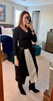 The asymmetrical wrap and pleated contrast give this skirt a striking, fashion-forward edge. It photographs with more pop than it wears, and the sit-down shuffle is real—but that’s part of its charm. All around, a great choice for someone seeking a unique twist on workwear that balances polish with personality. (I believe this is TTS, I typically size down on long skirts.)