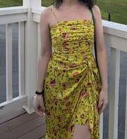 An amazing dress for any wedding occasion! It was so comfortable and the silky material is nice too. The back straps are adjustable. The colors on the pattern pop off of the dress and the yellow is a standout piece.