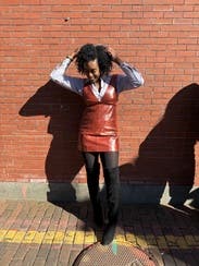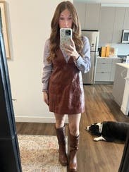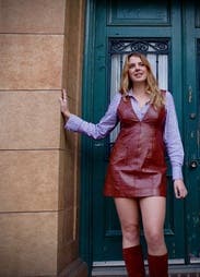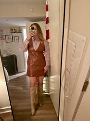 This Cinq à Sept piece combines a structured brown leather pinafore with a casual striped shirt for a playful yet sophisticated look. Pair with knee-high boots to complement the outfit's modern, edgy vibe.