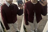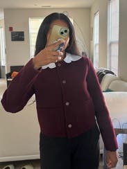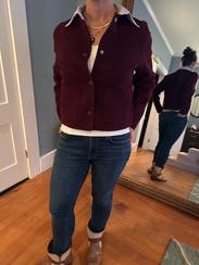 Gorgeous color for fall. Wore as a cardigan with long sleeve underneath. Slightly long for my petite length arms. Wasn't itchy. Missing striped collar but reminiscent of quiet luxury.