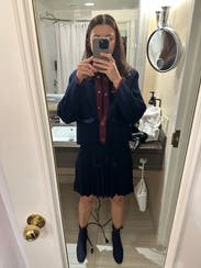 Wore to work and out to dinner. Super quality—thick and well made. Is a little boxy, but that’s the style. The pop of maroon gave it a nice chicness and elevated it a little. Would buy if it weren’t so expensive!