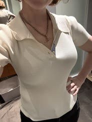 This fun little polo is excellent quality. The ribbed fabric has some stretched to it so it becomes form fitted the surprise blue accent when the buttons are open, gives it a little something special. Would recommend renting this one.