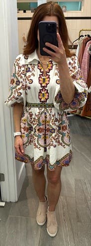 White (70% Cotton, 30% Linen) Mini Dress. V neck. 3/4 Sleeve. Front button closure. Shoulder to hemline length: 35". Imported.