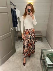 Loved this skirt for a Thanksgiving gathering - has such a beautiful Fall look. I paired with Marissa Webb cold shoulder sweater. The skirt fits TTS. The material lays well and is very flattering. Tall girl friendly!