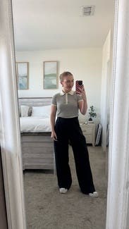 Wore with rtr Veronica beard shorts and loved! Top was a bit short in length but worked with the higher waisted shorts. Material is good for warmer weather because it’s mesh like. Loved!