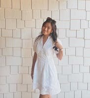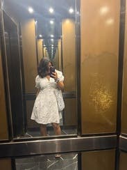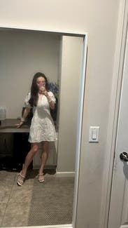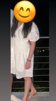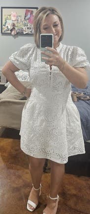 Wore this to date night, loved it! Obsessed with the material, a true bright white, high quality lovely details all throughout. The front buttons are a bit of a pain to maneuver if you’re trying to take the dress on/off, but they stay in place once fastened. In the hips it’s loose yet flattering, added a belt to cinch the waist in, sleeves are a little tight (so if you have fuller/thicker arms, beware).