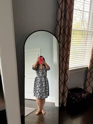 I appreciated the pattern on this dress and the thick material, but the neck is very deep and required a pin I for me. The wrap was nice but very large for me. I should have sized down. Length was doable for this petite, but the dress does open up when sitting down. Overall just an okay work dress.