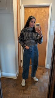 Love the vintage ski style of this sweater. Wore it on 2 ski trips. It’s on the boxier side which I didn’t mind but if you want it to be fitted I would size down.