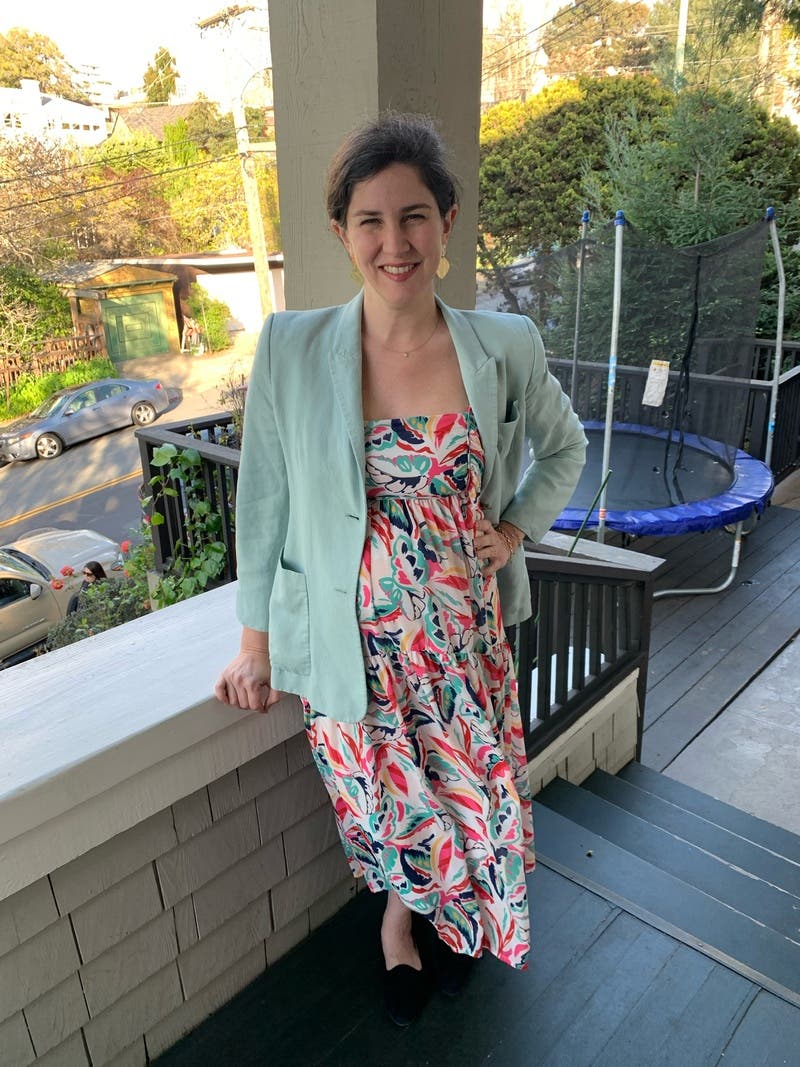 Green linen blend (55% Linen, 45% Viscose). Lining (100% Polyester). Jacket. Long sleeves. Front button closure. 28" from shoulder to hemline. Imported.