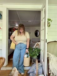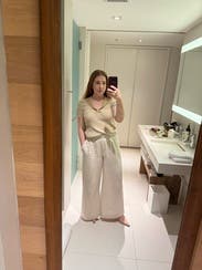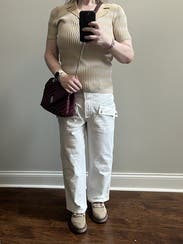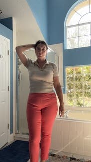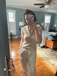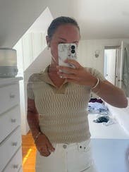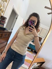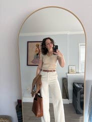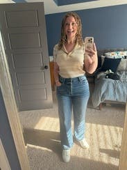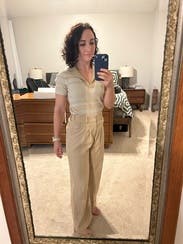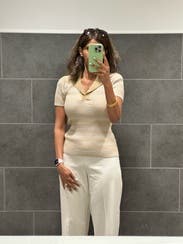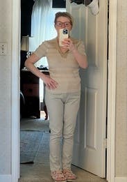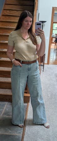 This unassuming top has a retro vibe and is so effortlessly chic. Got so many compliments on it and almost kept it. I paired it with linen pants and a camel blazer for work and also navy high waisted pants but it wound look great with some bell bottoms as well. I sized down so it wasn’t bulky or too long.