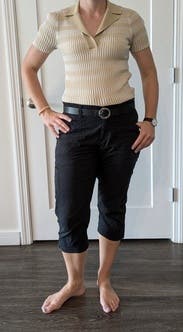 I love the unique pattern created by the ribbed stripes — a textured checkerboard look. I’m not a big fan of the color, though. It’s lightweight and comfortable, but the fit is a little clingy for my liking.