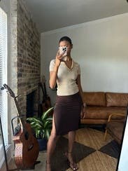 I really enjoyed this Club Monaco top. It runs true to size and has just the right amount of stretch. At 5’7 it fit my long torso perfectly, I had on my standard everyday bra. I feel like this top can really be dressed up or worn down. The material is really cool and you could still wear this top in the spring. I paired it with a skirt and some heels to complete this look.