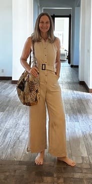 If you don’t like to iron, don’t rent. I think I spent 45 minutes trying to tame the wrinkles out of this cute safari suit & after a sauna’s worth of steam it still won. Pictures are after wearing it all day at work & that 20% linen blend is gonna linen, I guess. Pros: cute, comfortable & cool in hot summer weather. I got compliments from my coworkers. Cons: if you have a mom pooch or carry weight in the stomach, the buttons will pull and gap. Forget about putting your hands in the pockets for same reason. Fabric is also thin enough to show thong lines. I think it would work great on a tall athletic build or someone with a small waist. Pears and apples beware. The legs are also long so I had to wear platform wedges.