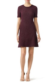 Purple jacquard (100% Polyester). Short sleeves. Crew neckline. Full skirt. Hidden back zipper. Partially lined. 36” from shoulder to hemline. Made in USA.