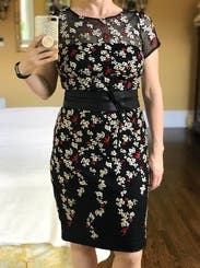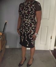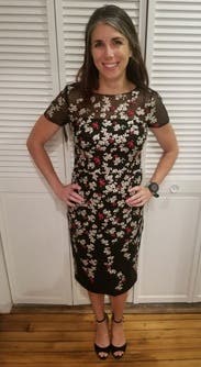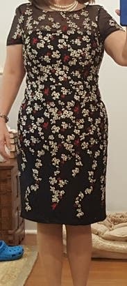 The floral print embroidery reminds me of cherry blossoms. It was comfortable and I got a lot of compliments. I just wore it for work. I did notice the sleeves limited my range of motion raising my arms over my head.. but it wasn't a big deal. Fit - I am 5'6", 36c, 155 and I felt it ran true to size. I wore an 8.