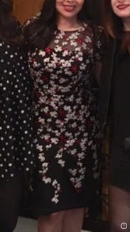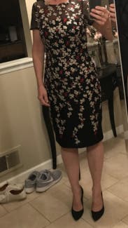 I wore this for an evening award event at work. It was perfect! Conservative but also very flattering. The embroidery was so beautiful. It was true to size and hit right at my knee. It was a little tight at the bottom so I had to be careful going up stairs but that was only one small negative. This is probably my favorite dress I have ever rented, wish I could have kept it!
