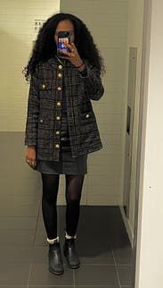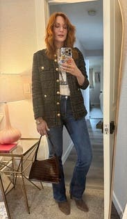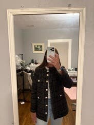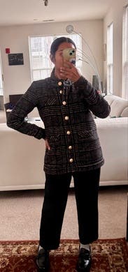 This jacket is absolute fire! The buttons are gorgeous and it instantly elevates any outfit, even a t-shirt and jeans. It’s a perfect weight for the fall season as well. It is cut a little closer to the body so this would be best layered over thinner knits and turtlenecks. I would rent this one again and again.