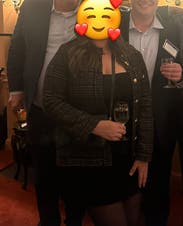 The jacket was new with tags - always nice to be the first to wear an item. I wore it to a work event. It wasn't a very flattering color - and jacket was very heavy.
