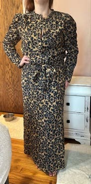 I loved this so much I’m still thinking about buying it. Good quality, pretty design, and great length to pair with heels. The shoulders have some styling to them elevating the look. I might size down for the next try but this was so comfortable and the button down front was great for me as a pumping mom.