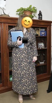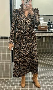 Loved this dress. I wore to work with a collarless black and brown blazer I own and black booties. Super comfortable. I pushed the sleeves up because they are also too long for me. Wished they made the sleeve mid length and just a smidge shorter, but the print is lovely. Looking at pic I maybe could have size down but it didn't feel too big