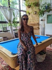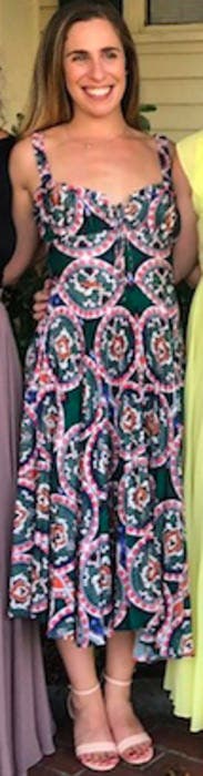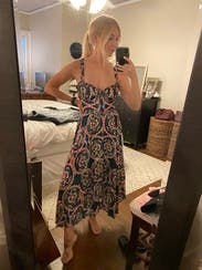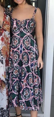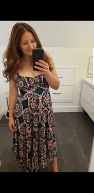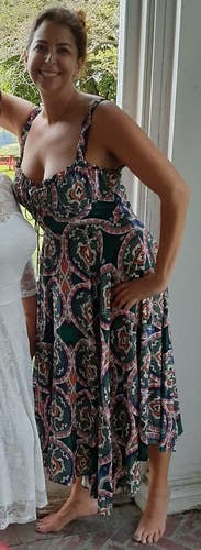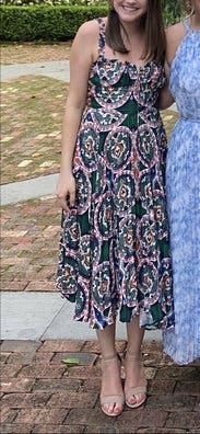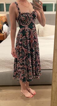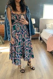 Loved the colors and cut of this dress. It's super flattering and very comfortable to wear. Easy to dress up or down too! I'm small chested so there was definitely some extra room up top and the straps were slightly big (not adjustable) but overall still a solid fit and will definitely rent again!