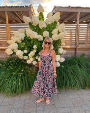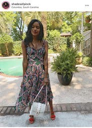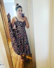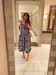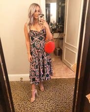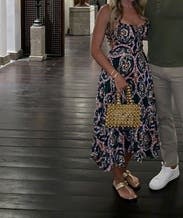 This dress was so much fun. It was easy to wear and twirled around when you danced. Super comfy and the pattern was beautiful. Got so many compliments! Initially, I was worried it'd be too tight in the chest area, but you can loosen it up thanks to the ribbon in the bust area which helped a lot. Can wear with a strapless bra or bra-less, the pattern lets you get away with it! Loved the midi length too. Would highly recommend for a great party dress!