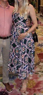 Lovely, standout dress. Great color, cut, and wrinkle free. It was a little snug at 5 months pregnant, but not unflattering. Perfect for the end of summer.