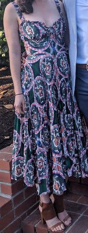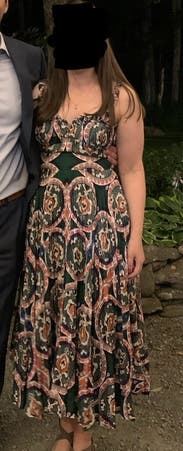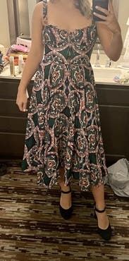 Wore to an outdoor wedding with a "garden formal" dress code. I felt like I nailed the dress code with the main color being green. The fabric was good quality and the pattern and asymmetrical hemline were very interesting. I got lots of comments on the dress. I probably should have worn the M since I've gained weight, but the M was too large in the bust for me to feel confident even though it was a little adjustable with a front-tie. The S worked out, but looking back you can see it's clearly too tight in the waist right under the bust and was starting to fold up. I also wish the dress was a bit shorter. Wearing 2.5" heels wasn't enough to get the true midi hemline shown on the model, which I think would have given me better proportions.