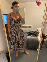 Loved the pattern, color, neckline and fit. Straps were a little loose and I pinned them. Worked best with a sticky bra. Fabric was a little warm on a hot/humid day but loved the movement and comfort generally. Would rent again and again.