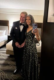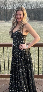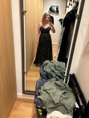 I loved wearing this dress! I got several compliments and I felt so fancy but also fun. I ordered both large and medium and they weren’t able to send the large, but the medium fit perfect. I expected it to be a little longer - I wore 2.5 inch heels and the dress was well above the floor. Which worked great. I was concerned about the bra situation because I have mom boobs and they sag but the dress held them up well without wearing a bra so I was super happy about that. Very glad I chose this dress!