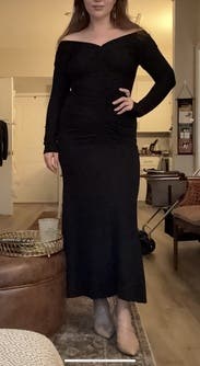 Poor picture but this dress was stunning! Perfect for a formal holiday gala event. Elegant, classy, sexy yet modest with sleeve and chest coverage. Hugs curves in all the right ways!! Material is stretchy and comfortable and provided a nice amount of warmth and seasonal flare on a very cold night. Hugs curves in all the right ways!! I’m 5’2 and the dress was exactly floor length with 2-3 inch heels.