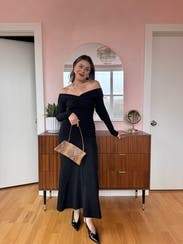 True to size. Perfect black dress for a fall/winter event. The off-the-should look was super classy in person. Would 100% rent again for an event!