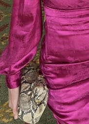 Very nice quality. The details say it’s snake skin embossed, but this felt reallllllly real to me. There’s nothing “just imprinted” about it. The scales flex in a really natural way, so much so that I felt my outfit snag in between scales that had flexed open and then closed when in movement. Zero damage to my RTR dress, I’m relieved to say. I got plenty in here - my phone, a small Wet brush, a card wallet, Bose ear buds, my keys, chapstick, lipstick, lip pencil, napkins, a full size antiperspirant deodorant. It can be used as a clutch and as a shoulder bag, by taking out the golden chain inside. I liked it.