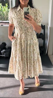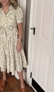 Felt cute hosting a breakfast for friends in this dress. Forgiving fit due to the tie around the waste, and easy to style. Although I think the colors work for fall, it is hard to pair with a sweater with the puff sleeves.