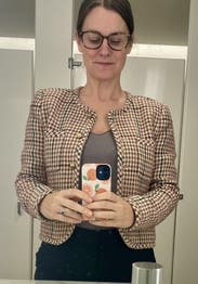 I rented this blazer for work because I loved the color, but it wasn't my favorite rental. Despite being lined like a blazer, the thick, heavy fabric made it feel more like a sweater. It was too warm for me even in early spring, and I'm someone who's usually cold. Fun enough, I saw someone wearing it on a TV interview while I had it, so it might be perfect for a different person or climate.