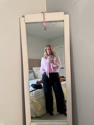 This piece is absolutely adorable! I love the versatile scarf tie detail on the front, which allows for different styling options. While it's a little itchy, the material is overall super soft. It's perfect for various occasions, whether you're heading to work, running errands, or going out to dinner. The color is lovely and suits any season. I'd recommend sizing up for a looser fit. In person, the baby pink color is very pigmented and vibrant.