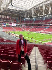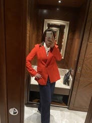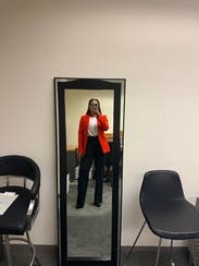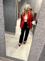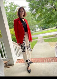 Red (53% Cotton, 41% Viscose, 6% Elastane with 100% Polyester lining). Jacket. Long sleeves. Front button closure. 29.5" from shoulder to hemline. Imported.