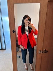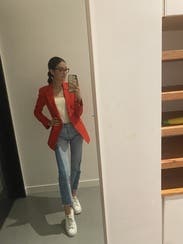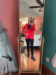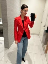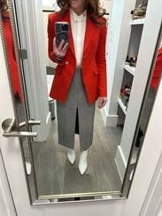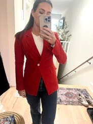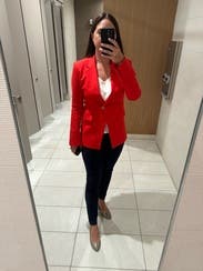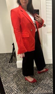 This vibrant red blazer from Derek Lam 10 Crosby radiates confidence with its sharp tailoring and bold color. Ideal for making a statement, pair it with classic denim for a casual-chic look or dress pants for a powerful work ensemble.