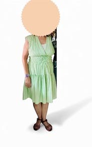 Easy breezy for hot summer day. Love the green stripes. Very flattering! Cinches at waist and shows off figure. I did have to use Hollywood tape on the top to keep it from gaping open. Really loved this!
