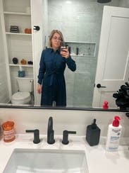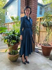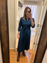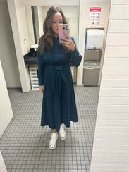 Pictures don’t do it justice - beautiful blue and got lots of compliments. Paired with a belt (the tie belt included is sewn in), worked out great for a work event day to night. A little tight in the bust - but easily fixed with a pin. Highly recommend