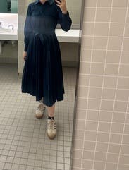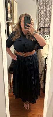 Loved this dress very fun and professional war to a conference and got so many compliments. The pleats are really cute in the skirt It fit well would definitely rent it again. I’m pretty busty and didn’t have any problems with the buttons gaping..
