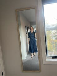 This dress is comfortable and easy to wear. The color is beautiful, and it did not wrinkle throughout the day. There is a bit of stretch in the material, so you don’t feel restricted. The waist is just a tad bit high. I wish it was like an inch lower. Great otherwise.