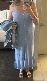I love the color of this dress and how it fit from the waist down. I have a smaller chest and because there are buttons going down in the front, it does tend to weigh the dress down a bit. Because of this, I found that I often had to pull the dress up in order to fully cover myself. Definitely something to note especially if you aren’t someone who has a fuller chest.