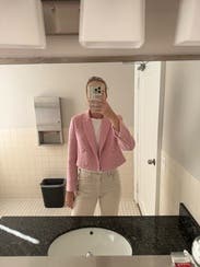 I don’t usually wear pink, but this looked super tasteful. Even though you couldn’t see the white top I had on under it, I still feel like I looked covered and professional. It’s a very well made blazer. Impressed with it. If it was in a color I’d wear more, I’d have kept it.