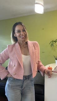 Love this cropped, tailored, tweed blazer! There is a shiny gold thread woven in so has a very slight sparkle in the light. The material is kind of thick so would be best for cooler temps. Love the fun Barbie pink, great for work!