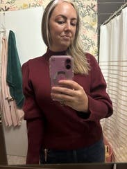 Rented this sweater to match with a skirt I ordered but didn't realize the colors didn't match as I imagined lol Sweater was good for work though I realized I don't love the tighter sleeves with the puffed out look on my biceps. Has a bit of a turtleneck going on.