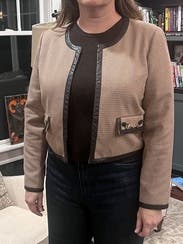Loved this jacket and wore it for a work conference and paired with the ASTR brown velvet dress and received tons of compliments on this rental. Highly recommend. Will probably buy this jacket, it’s chic and I love the equestrian theme on the pockets. The jacket has dark brown leather on the edges but has a houndstooth pattern of burnt orange, black and cream. Versatile piece.