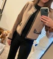 One of the cutest jackets ever!! Fits true to size and looks soooo expensive I felt so fun wearing it to work