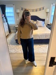I like this rental. Options to wear with jeans or high waisted skirt. A bit cropped but not bad. Wasn't itchy and kept me warm.